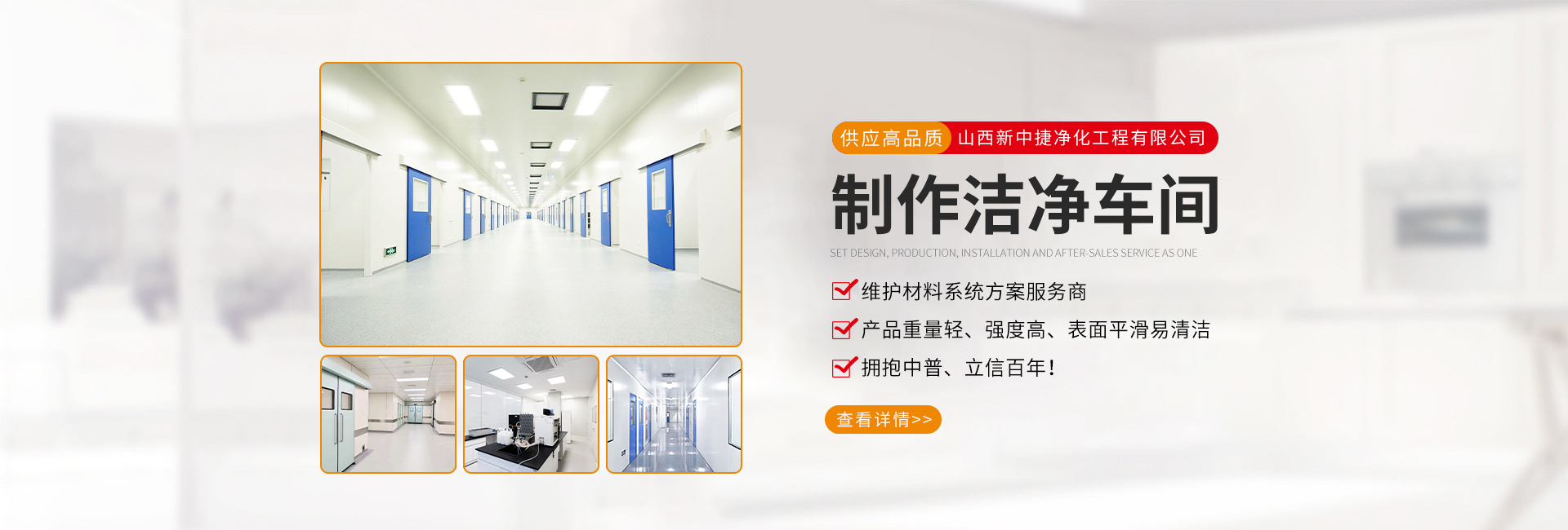 山西新中捷凈化工程有限公司是從事凈化工程的設計、開發、生產、安裝、經營于一體的凈化板生產廠家擁有生產以上產品的全套設備,是山西凈化行業服務提供商。在公司發展壯大過程中,我們始終為客戶提供好的產品和技術支持、健全的售后服務。公司從事各類凈化板、夾芯板研發、制造和銷售。我們擁有多種夾芯板、凈化板、彩鋼生產線成套設備,產品有各種型號的巖棉凈化板、手工凈化板、機制凈化板、紙蜂窩凈化板、泡沫凈化板、硫氧鎂凈化板、聚氨酯凈化板、彩鋼凈化板等,我們所生產的每一個產品均符合相關行業要求,每年定期將所生產產品進行質量測試,另公司內部也擁有獨立的...